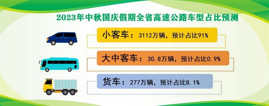 根据历年国庆假期车型分布数据分析,预测 2023 年中秋国庆假期主要以中短途、探亲旅游车流为主。预计小型客车流量约 3112 万辆,占比约 91%;大中客车约为 30.8 万辆,占比约 0.9%;货车约 277 万辆,占比约 8.1%。
