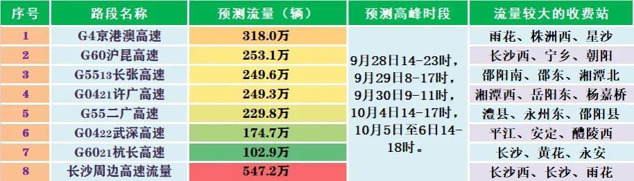 9 月 28 日 14 时开始,提前返乡过节出程车流增多,路网流量迅速走高,全省路网高位运行,特别是在 14 时至 23 时,处于收费期,高速公路呈现拥堵高峰状态,城市周边收费站出入口流量 " 井喷式 " 增长,易缓行和拥堵。部分收费站入口(长沙西、长沙、学士、雨花收费站)车流可能呈井喷态势,或有车辆间歇性排队现象。