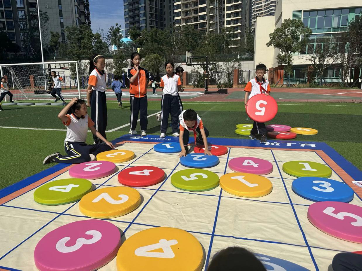 活动当天,校园里的各处都设置了好玩的数学地面游戏,孩子们在数学老师的指导下协作探究,展开了生动而有趣的“对决”,攻克一个又一个关卡,欢乐的笑声回荡在校园。