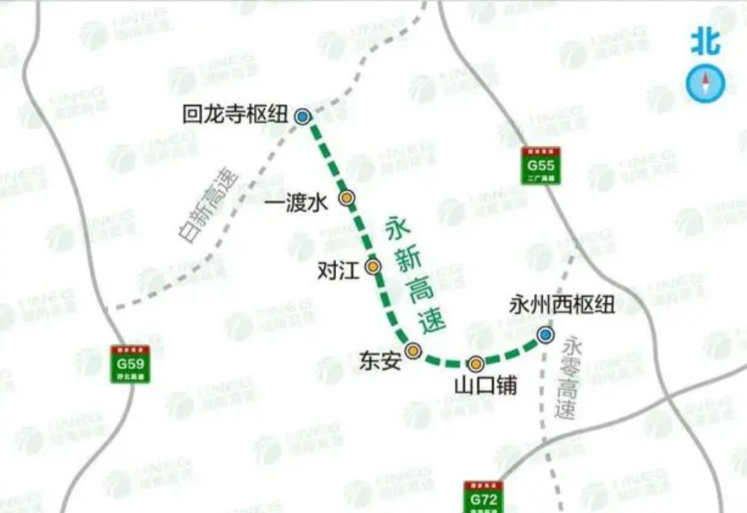 永新高速起于永州市东安县井头圩镇浸马塘,设永州西互通接永零高速公路,终于新宁县回龙寺镇,接白新高速、新新高速。项目主线全长64.413km,设计速度100km/h,全线共设桥梁62座。