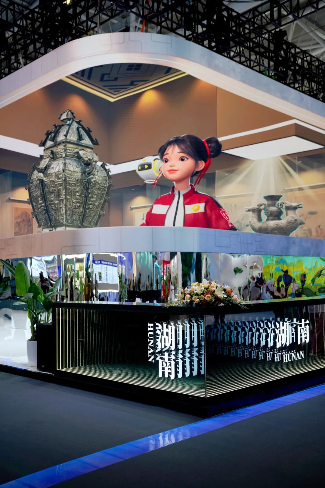 展会当天,湖南展馆入口上方的巨幅裸眼3D屏幕上,一位年轻女孩飞跃于湖南第一师范学院、岳麓书院、橘子洲毛泽东青年艺术雕塑等湖湘文化地标景点,随后停留在湖南博物院,与院藏文物皿方罍进行互动,数字版“素纱单衣”“T形帛画”随即出现于屏幕之上。