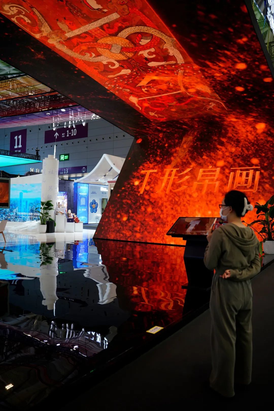 本次湖南展馆设置了巨幅7字型屏幕,穿越千年来到现代的T形帛画携带着耀眼的红色光芒,吸引着观众前来打卡。技术人员对T形帛画开展了基于超高清信息采集与AI视觉算法技术相结合的数字化采集,通过视频还原让更多的人“触眼可及”真实帛画。游客直呼:“这种形式太震撼了,有机会一定要去湖南博物院参观!”