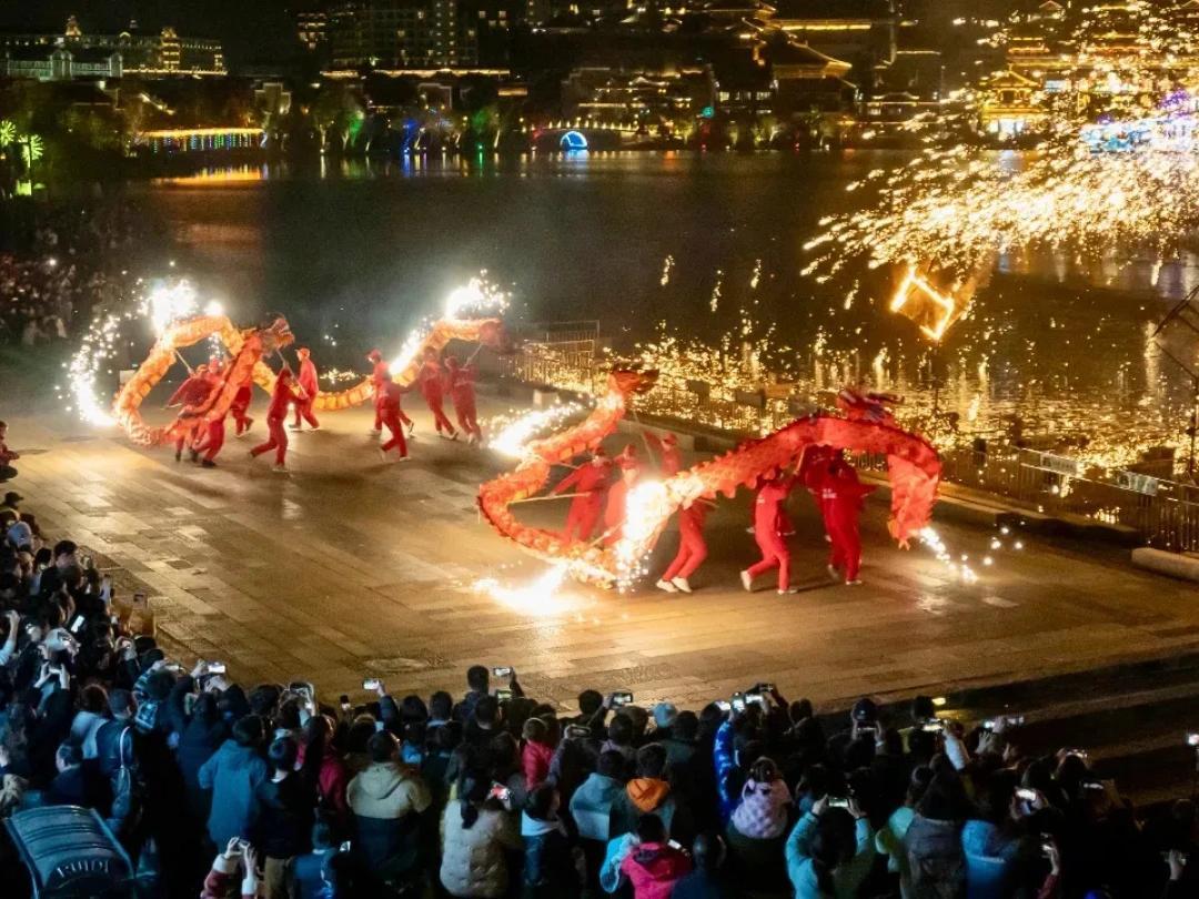 5.国风演艺。有斗鸡、看打神鞭、飞斧等民间绝活,锦绣铜官大巡游、长风镖局等超多沉浸好戏,也有特技秀《黑石远渡》、行进式沉浸式市井演艺《无梦到铜官》,更有非遗绝技火龙钢花。