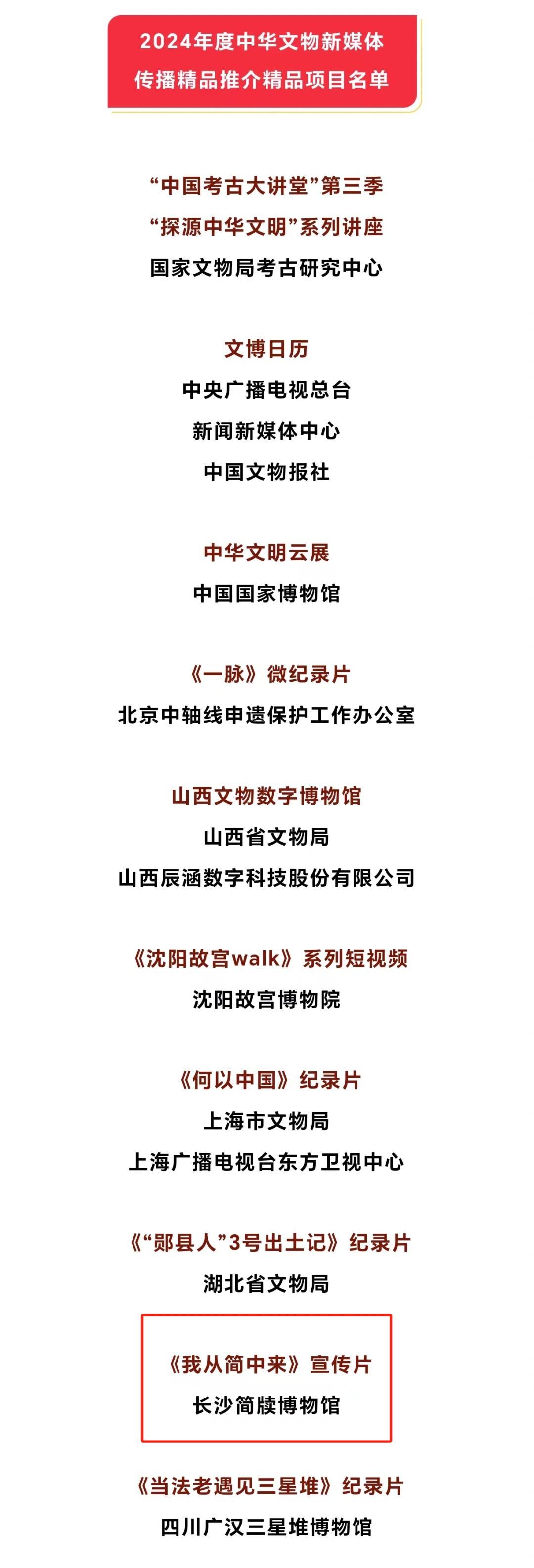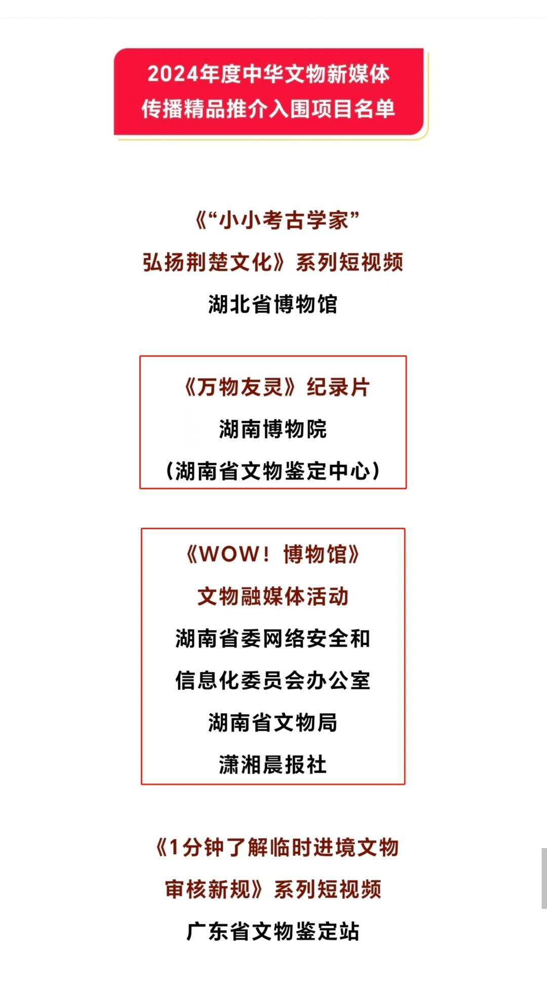 开幕式公布了2024年度中华文物新媒体传播精品推介精品项目、优秀项目和入围项目名单。其中,长沙简牍博物馆的《我从简中来》宣传片荣获全国十大精品推介项目殊荣,湖南博物院(湖南省文物鉴定中心)的纪录片《万物友灵》以及湖南省委网络安全和信息化委员会办公室、湖南省文物局、潇湘晨报社联合推出的文物融媒体活动《WOW!博物馆》也成功入围。