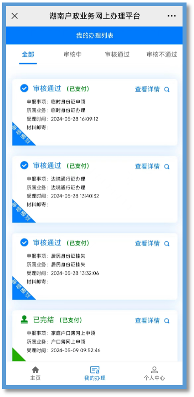 三、短信通知。申请人也可在平台首页“我的办理”中查询详情。