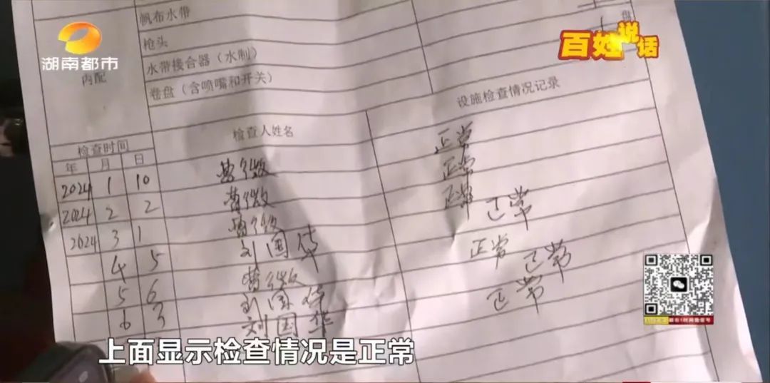 记者:我们有看到7月3日的消防设施维护卡上,上面显示检查情况是正常,刚刚我们也是打开了多个消防设备。
