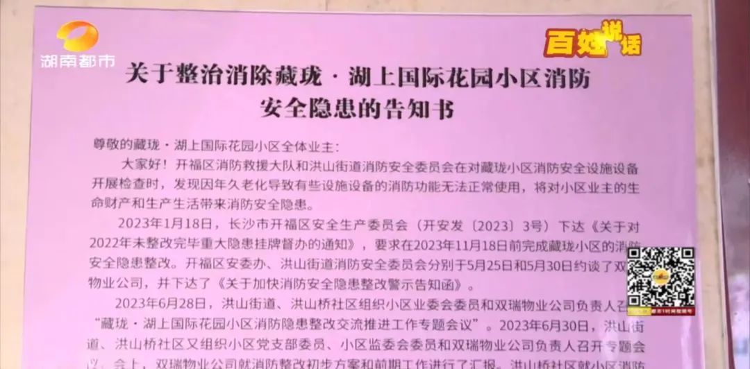 针对藏珑湖上国际花园小区消防设施设备无法正常使用,2023年7月,洪山街道消防委员会、洪山桥社区就下达了安全隐患告知书,并要求加快消防安全隐患整改。现在,一年过去了,为何该小区的消防设施设备未整改到位呢?