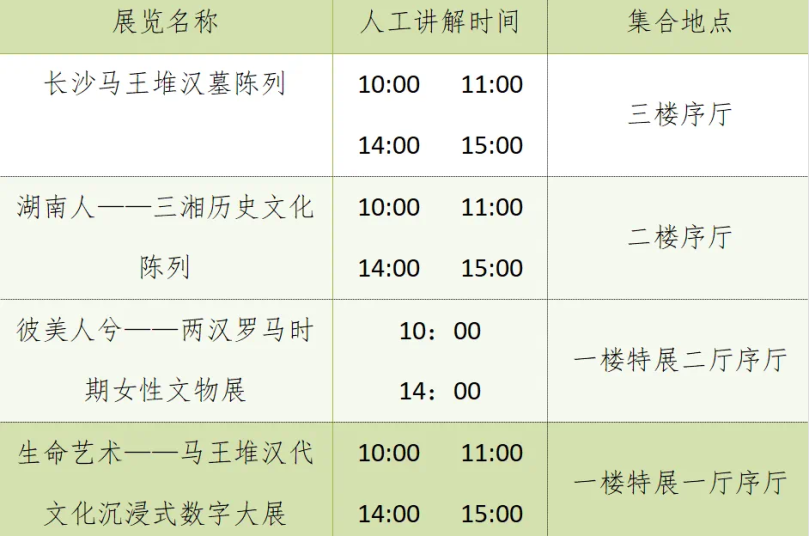 长沙马王堆汉墓陈列 湖南人——三湘历史文化陈列 青春是用来奋斗的 ——毛泽东青年时期文物展 亘古的祈愿 ——梅山文化圈雕塑与信仰展 彼美人兮 ——两汉罗马时期女性文物展 |