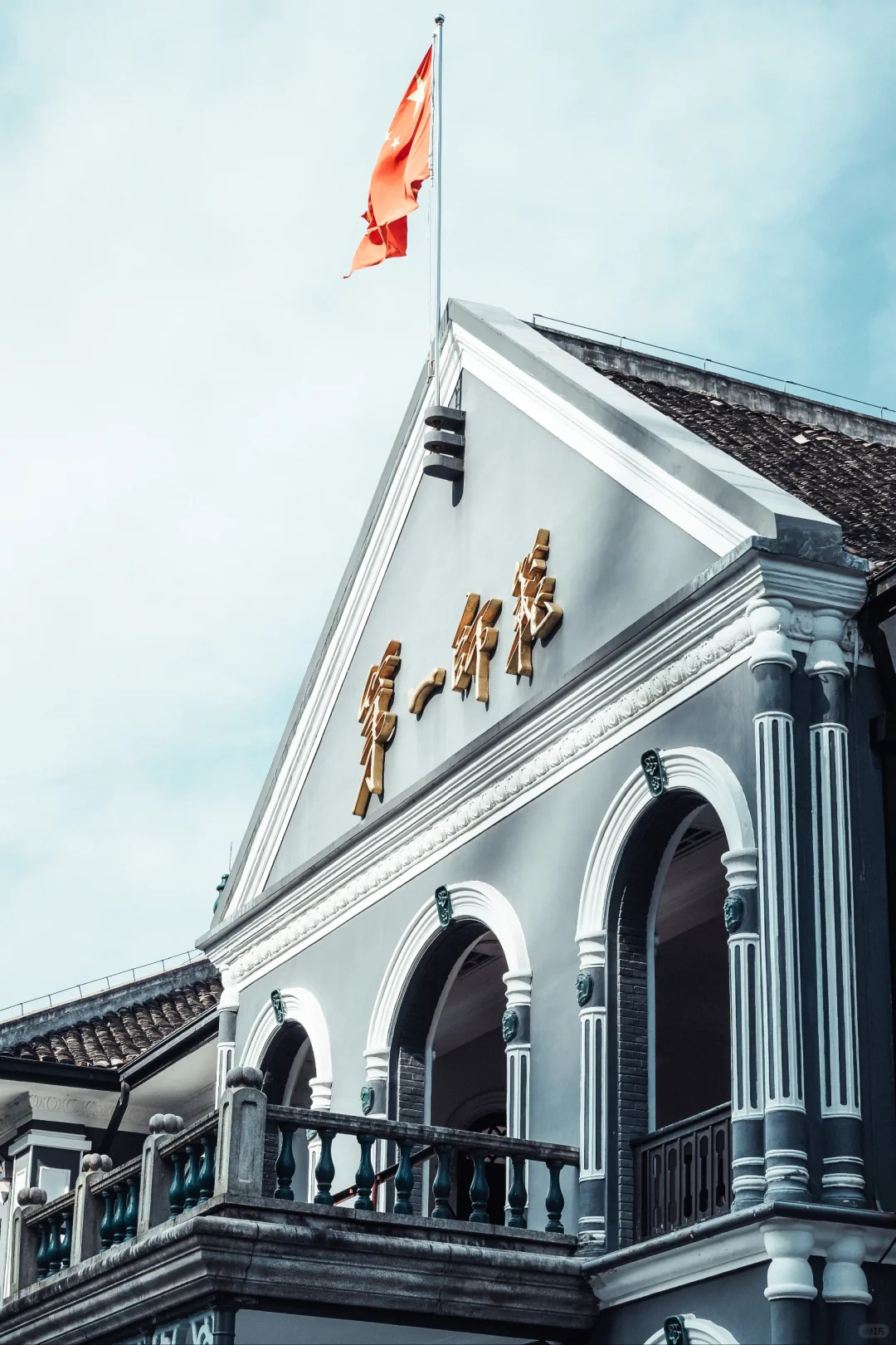 是一栋黛瓦灰墙的砖木结构建筑