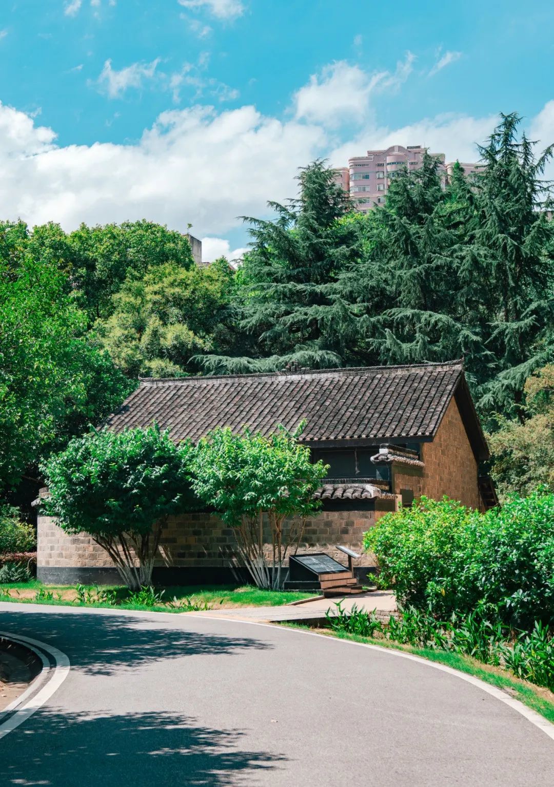 错落的青灰色建筑与恰到好处的绿植点缀