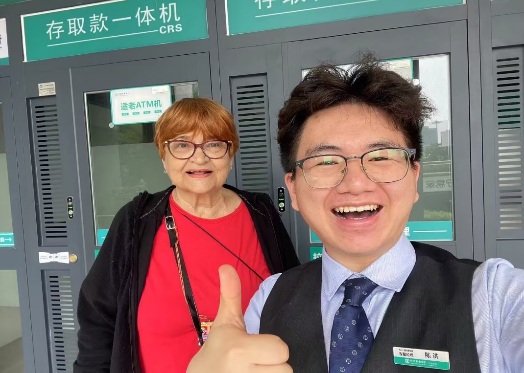 2025年3月27日中午,正在网点大堂值班的陈洪发现网点外有一位外籍女士在ATM机附近徘徊,于是陈洪立马上前询问其需要办理什么业务。经过简短的沟通得知,改名女士来自德国,来长沙旅游时发现身上携带的零钱不够用,于是来到了银行想要兑换一些欧元零钱。陈洪立马将该名女士引导至外币服务绿色窗口,为外籍女士快速地兑换好了所需面额的零钱。外国有人惊喜地称赞道:“没想到能如此便捷地办理好业务,真是太感谢你们啦!”