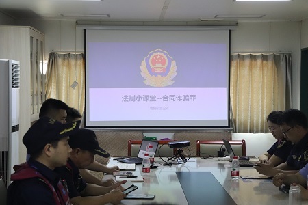 派出所专职法制员李警官结合近年来一些合同诈骗案例给广大船员讲解了几种经典合同诈骗方式、诈骗合同所具有的要素,并提醒船员朋友:在签订合同时一定要小心谨慎,要提前了解对方是否具有履行合同的能力,谨防合同诈骗,在场船员频频点头。