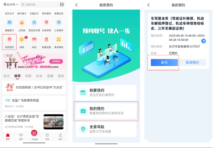 预约成功后,按照预约时间到达长沙市政务服务大厅二楼D厅的公安窗口专区,在手机端登录 “我的长沙”APP或者微信小程序,进入“政务预约”➡“我的预约”➡“取号”,随后等待系统的短信叫号提醒,前往指定窗口即可办理业务。