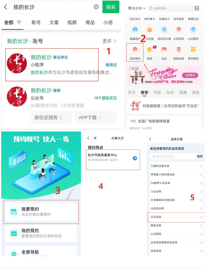 通过应用市场搜索“我的长沙”下载APP或微信小程序搜索“我的长沙”,首页选择“政务预约”➡“我要预约”➡“长沙市政务服务中心”➡“公安业务”➡选择需要办理的业务➡选择合适的时间段进行预约。