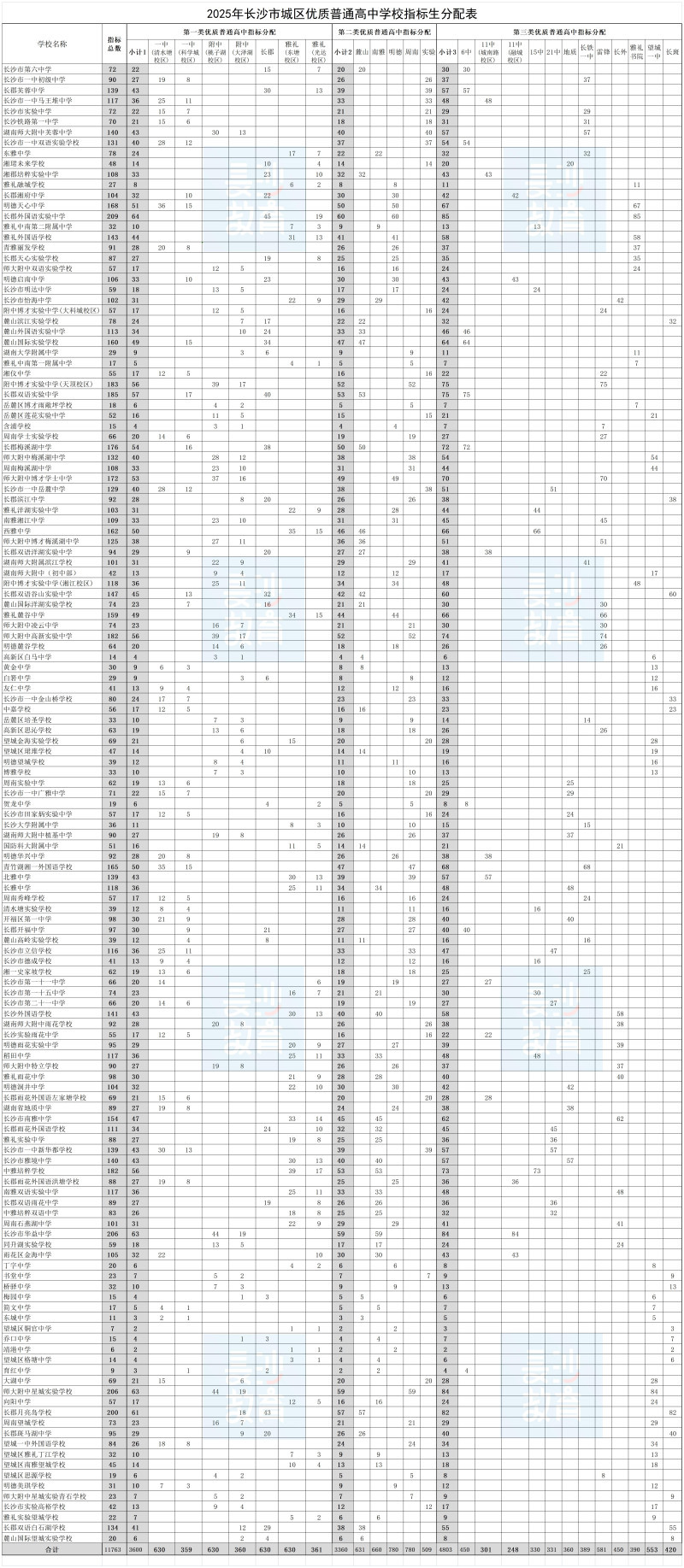 2025年长沙市城区优质普通高中学校指标生分配表: