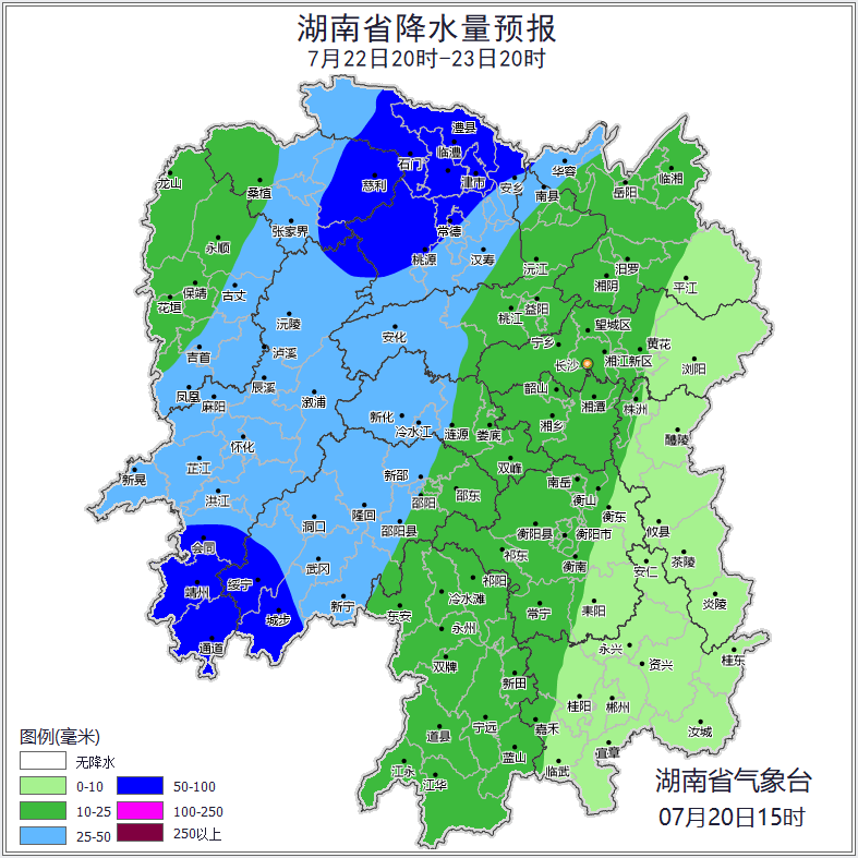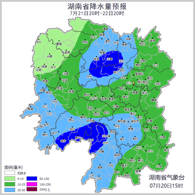 21日晚上至22日白天,全省阴天,大部分地区有中到大雨,其中常德南部、益阳、邵阳南部、永州北部局地暴雨;北风2~3级,雷雨时阵风7~9级;最高气温30~34℃,最低气温23~27℃。