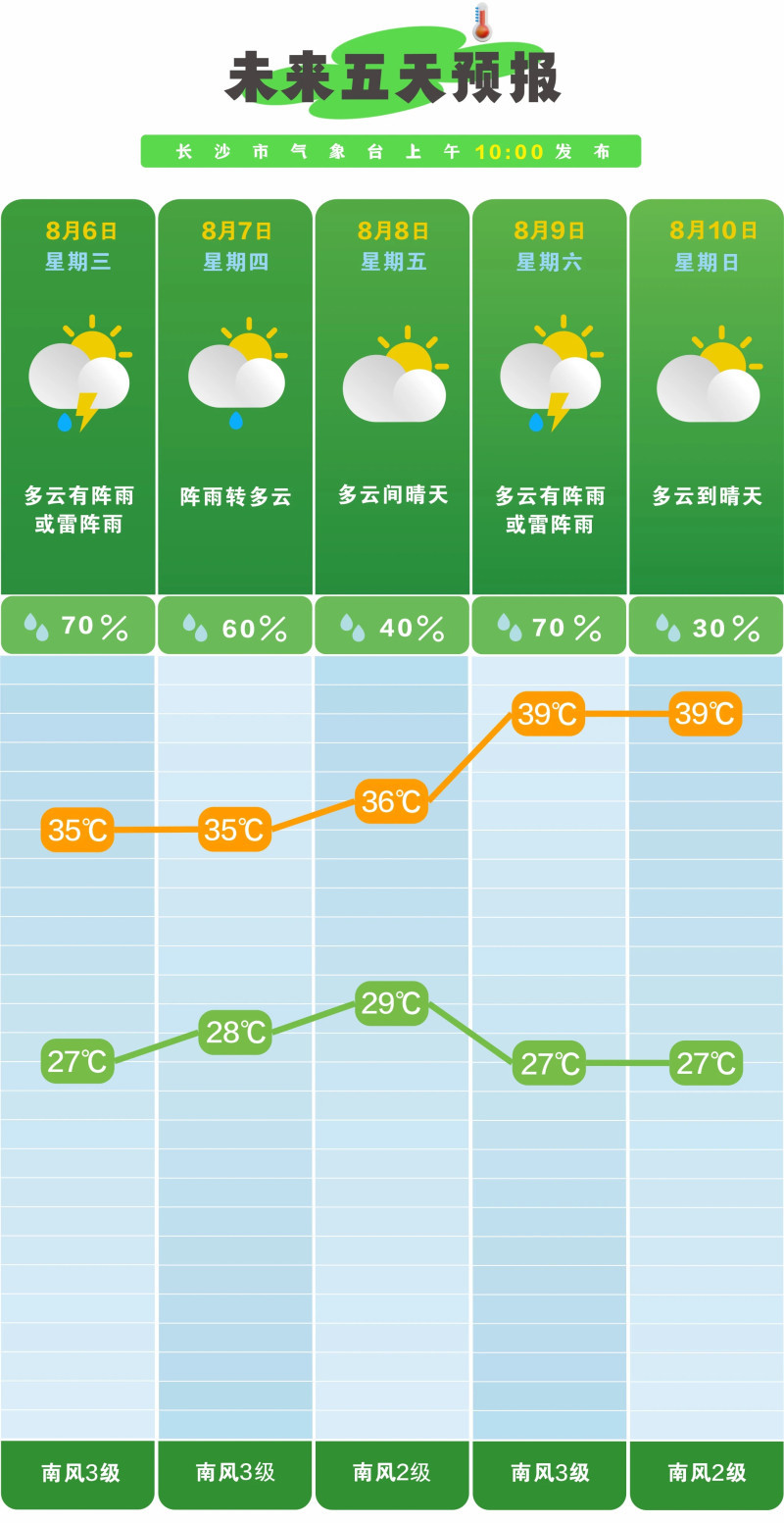 据省气象台预计,5日晚到8日白天省内多阵雨或雷阵雨;6日到7日湘中、湘南局地暴雨,未来三天省内部分地区高温持续,6日湘西北局地可达38℃。与此同时,长沙市气象台预计,6日长沙多云有阵雨或雷阵雨,27℃至35℃;7日到10日,多云到晴天为主;11日到12日,多云有阵雨或雷阵雨。记者注意到,虽然眼下即将“立秋”,但三伏未过,高温依然强盛,本周末日最高气温将升至39℃左右。