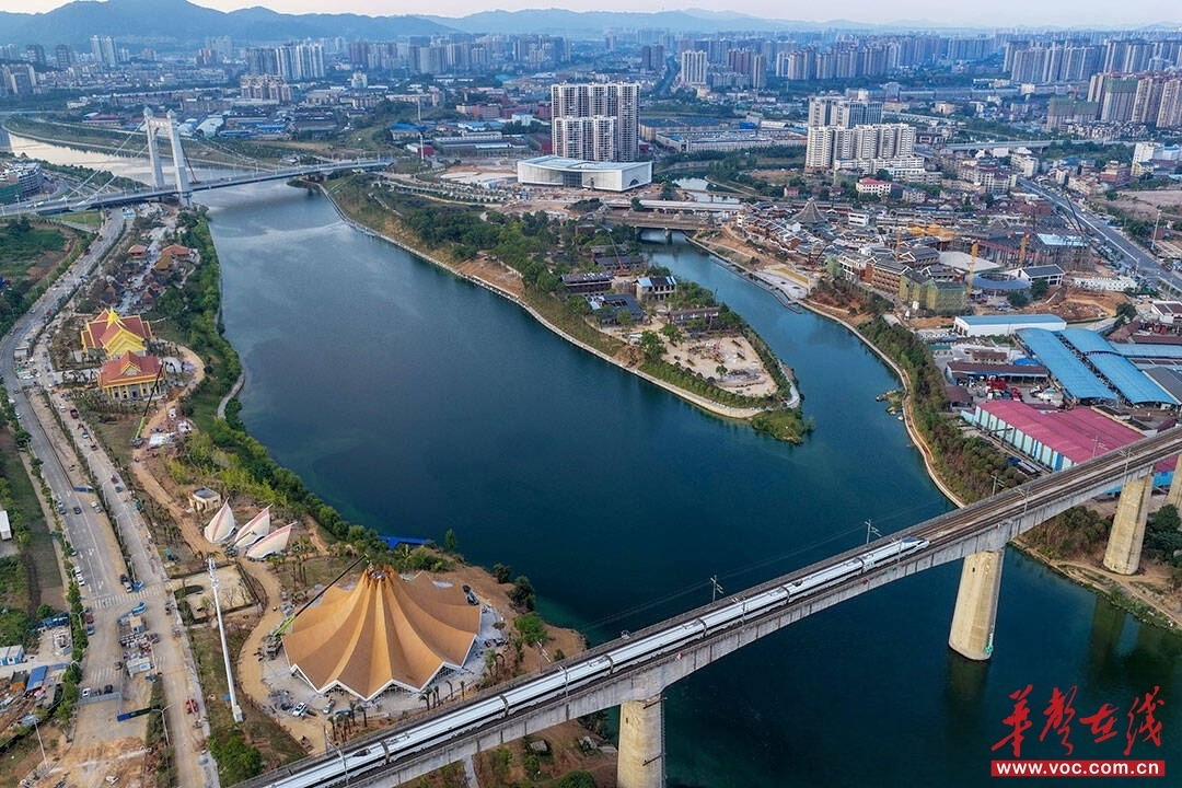 8月3日傍晚,一列行驶在沪昆高铁上的高速列车经过怀化东盟集、榆树湾、天问岛、怀化大剧院等地,勾勒出一幅高铁掠影与城市晚景动静相衬的图景。(潘雨 摄)