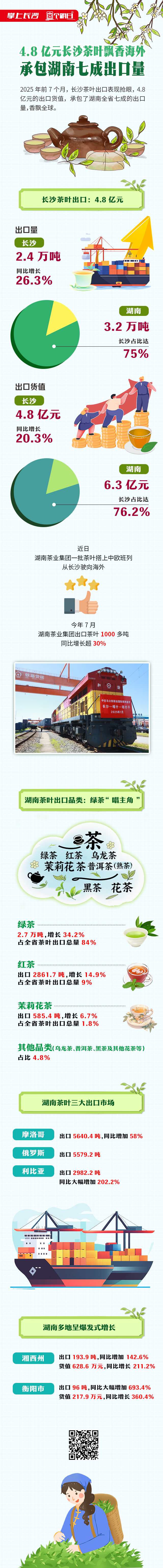 2025年前7个月,长沙茶叶出口表现抢眼,4.8亿元的出口货值,承包了湖南全省七成的出口量,香飘全球。