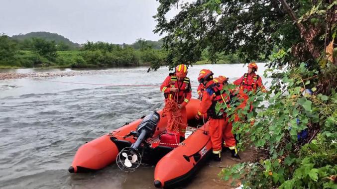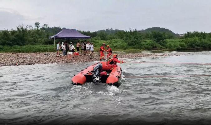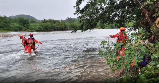消防员携带绳索率先涉水渡河