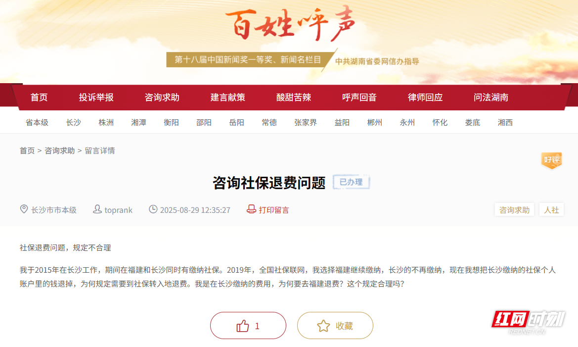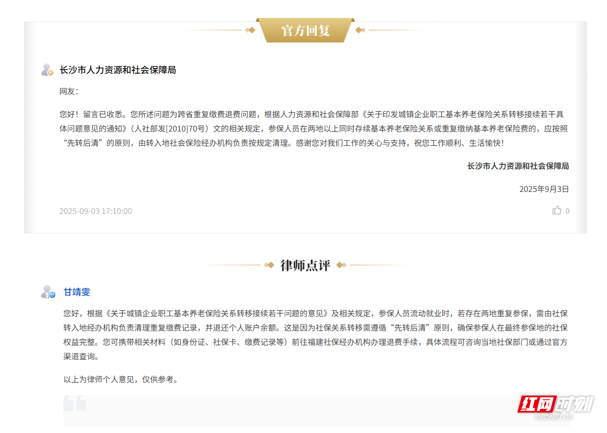 红网时刻新闻9月4日讯(记者 陈星晓)近日,一位网友在红网《百姓呼声》栏目咨询社保退费问题,反映自己曾在长沙与福建两地同时缴纳社保,2019年后选择仅在福建继续参保,现在他希望退回长沙社保个人账户中的余额,却被告知需至福建办理退费。该网友质疑:“在长沙缴纳的费用,为何要去福建退费,这个规定合理吗?”9月2日,长沙市人力资源和社会保障局回应称,跨省重复缴费需按国家“先转后清”原则,由社保转入地负责办理退费。
