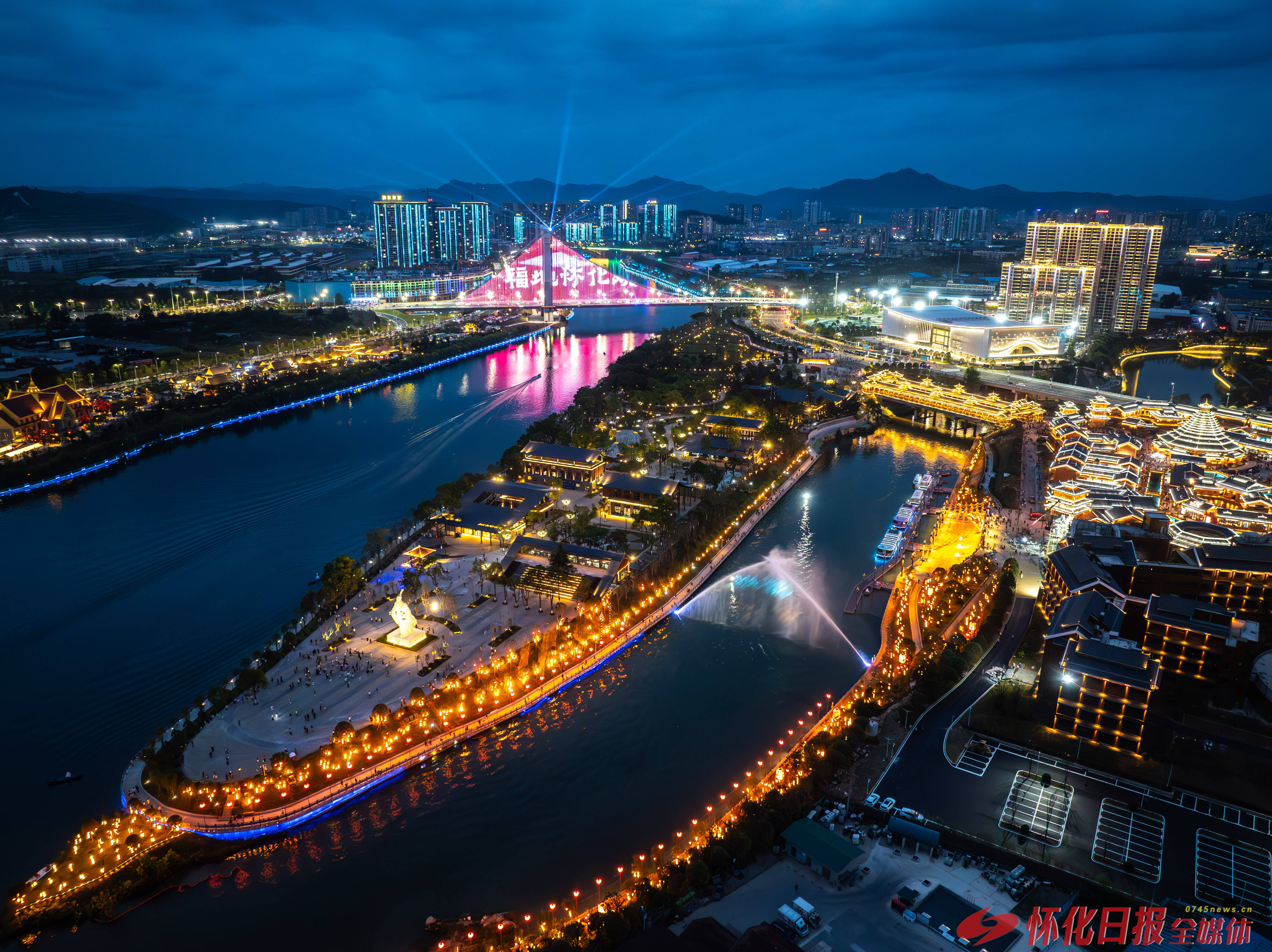 若想完整领略这份独特风情,不妨从榆树湾码头登船,开启全长5.2公里的水上航程。随着夜游演艺《福地长歌》开启,一幅绚丽的历史画卷在眼前徐徐展开:从屈子行吟、叩问天地的“福源”,到通道转兵绝境逢生的“福运”;从芷江受降挺立民族脊梁的“福佑”,到杂交水稻哺育人类的“福梦”;从“义利相济”的洪江古商城,再到国际陆港“福满五溪、商通天下”的繁荣……怀化的历史变迁与文化传承,在光影流转间一一呈现。