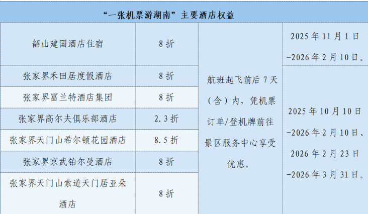 旅客凭有效机票或登机牌,即可在航班起飞前后7天(含)内,享受长沙、张家界、韶山三地多家核心景区、精品文旅演艺及精选酒店的专属优惠,涵盖了杜甫江阁、张家界国家森林公园、韶山毛泽东纪念园、《魅力湘西》《最忆韶山冲》等知名文旅项目,为航空旅客提供一站式、高附加值的湖湘文化体验,实现“航程即旅程”的无缝衔接。