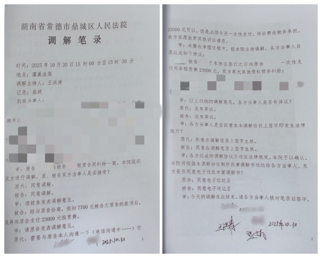 近日,湖南省常德市鼎城区人民法院成功调解了一起因吊车租赁费用引发的合同纠纷案件。此次调解邀请了区人大常委会党组书记、主任余习琼等人大代表,与区法院党组书记、院长胡志勇共同参与,最终促成双方当事人达成调解协议并当场履行完毕,实现了“案结事了人和”的良好法律效果与社会效果。