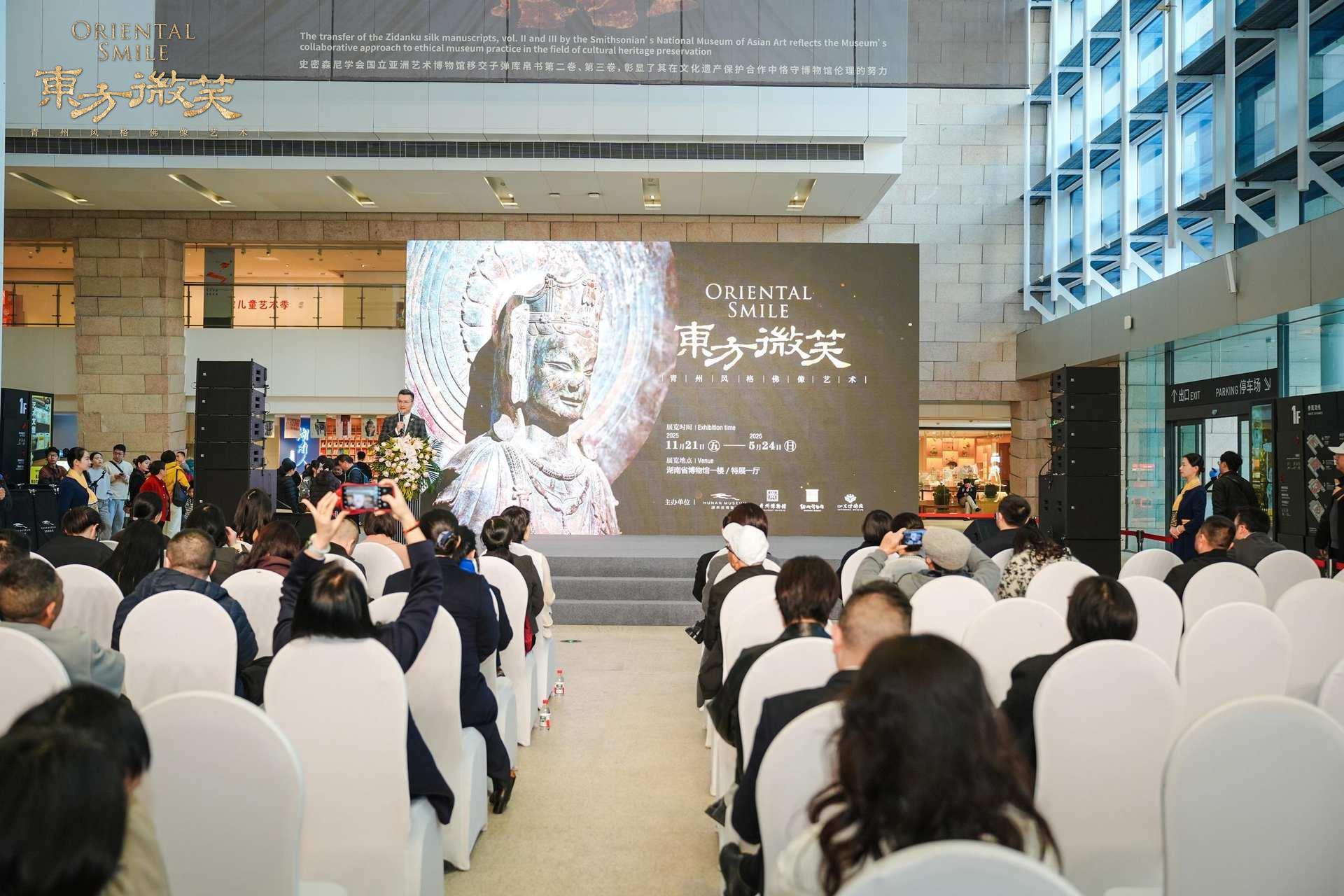 11月21日上午,“东方微笑——青州风格佛像艺术展” 在湖南省博物馆正式开幕。湖南省博物馆党委书记、馆长段晓明,青州市博物馆党支部书记、馆长曾磊,诸城博物馆党支部书记、馆长姜珊,展览联合策展人山东博物馆典藏部副主任宋爱平出席开幕式并致辞。湖南省文化和旅游厅、省文物局相关领导以及省内外各相关博物馆与机构同仁、湖南省博物馆领导班子成员、策展团队、省内外新闻媒体代表等出席开幕式。