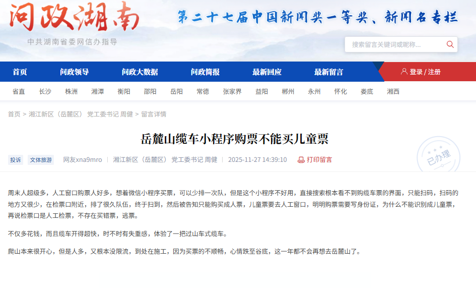 红网时刻新闻12月4日讯(记者 陈星晓)近日,有游客在红网《问政湖南》栏目反映,通过岳麓山景区官方微信小程序购买下山缆车票时面临诸多不便。具体包括:小程序内购票入口隐蔽、不易查找,现场主要依赖扫码购票但二维码标识较少;线上仅支持成人全价票,儿童等优惠票仍需返回人工窗口排队购买,高峰时段耗时较长。此外,部分游客提及缆车运行速度偏快、景区内人流拥挤等问题,也影响了整体游览体验。