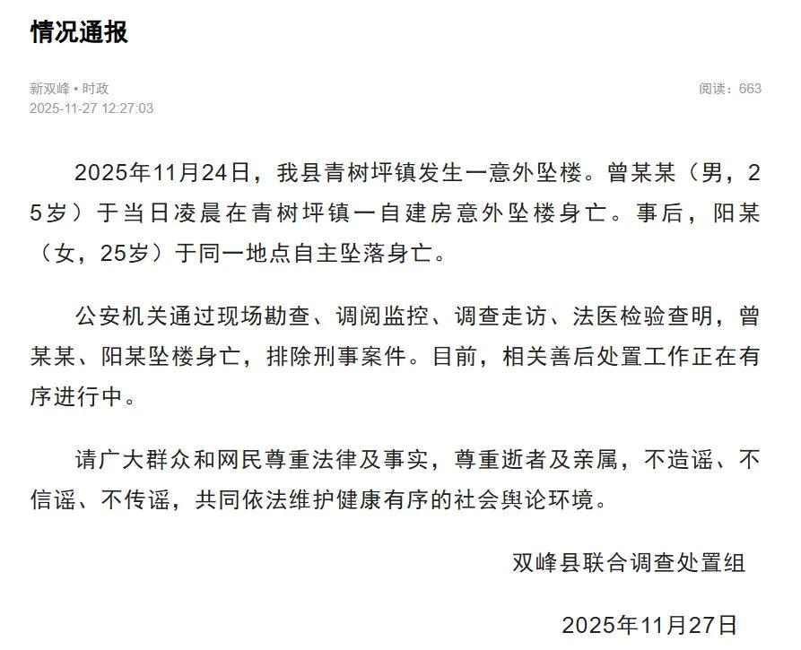 2025年11月24日,我县青树坪镇发生一意外坠楼。曾某某(男,25岁)于当日凌晨在青树坪镇一自建房意外坠楼身亡。事后,阳某(女,25岁)于同一地点自主坠落身亡。