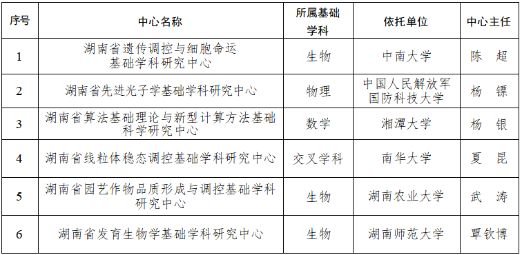 此次拟组建的湖南省基础学科研究中心,包括湖南省遗传调控与细胞命运基础学科研究中心、湖南省先进光子学基础学科研究中心、湖南省算法基础理论与新型计算方法基础科学研究中心、湖南省线粒体稳态调控基础学科研究中心、湖南省园艺作物品质形成与调控基础学科研究中心、湖南省发育生物学基础学科研究中心,依托单位分别为中南大学、国防科技大学、湘潭大学、南华大学、湖南农业大学、湖南师范大学,涵盖生物、物理、数学、交叉学科等基础学科。