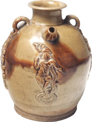 唐长沙窑青釉褐斑舞蹈人物纹执壶
