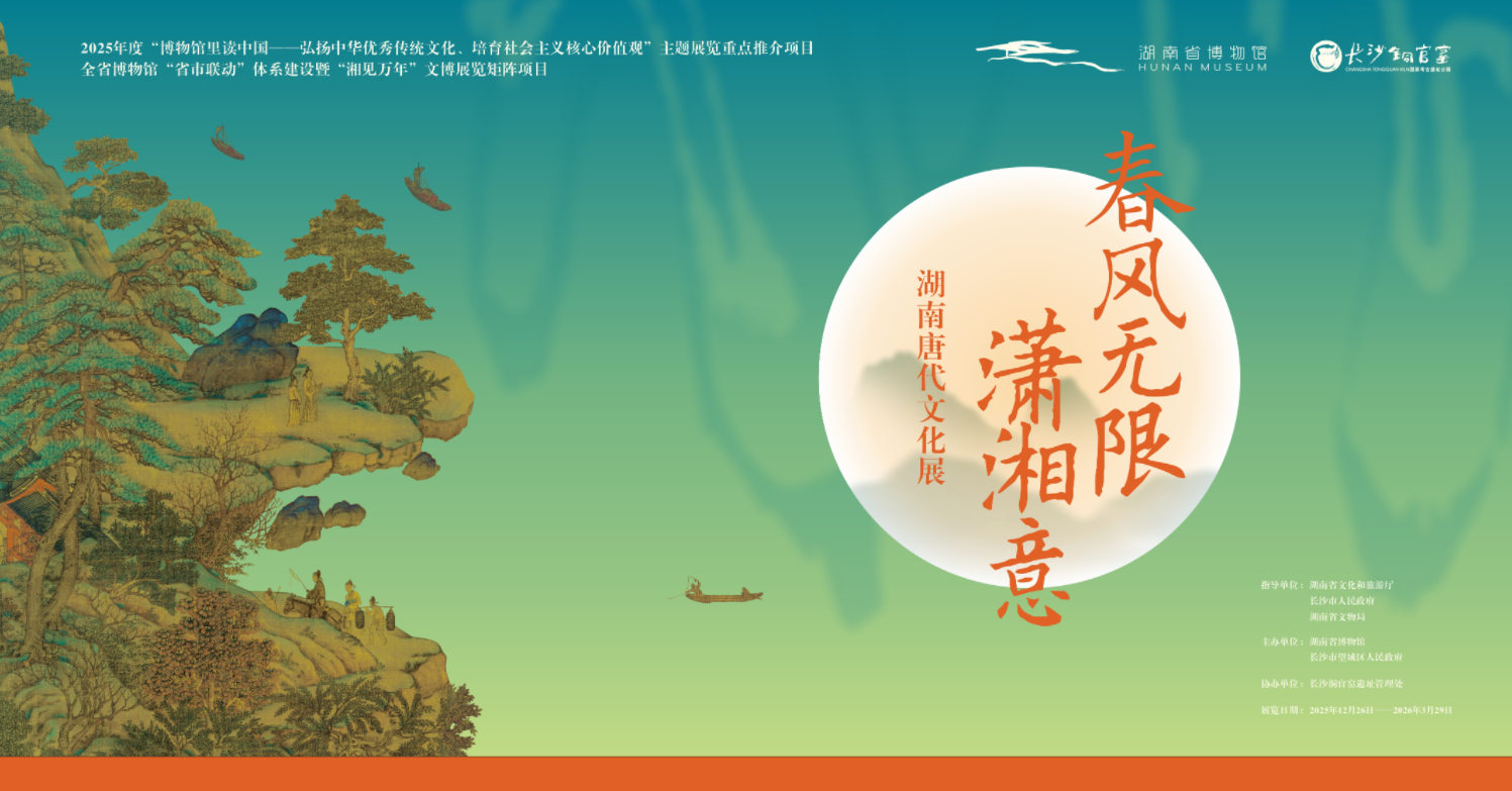 2025年12月26日,由湖南省博物馆策划实施的《春风无限潇湘意——湖南唐代文化展》在长沙铜官窑博物馆开展。该展览为全省博物馆“省市联动”体系改革暨“湘见万年”文博特展矩阵系列展览,并荣获2025年度“博物馆里读中国——弘扬中华优秀传统文化、培育社会主义核心价值观”主题展览重点推介项目。