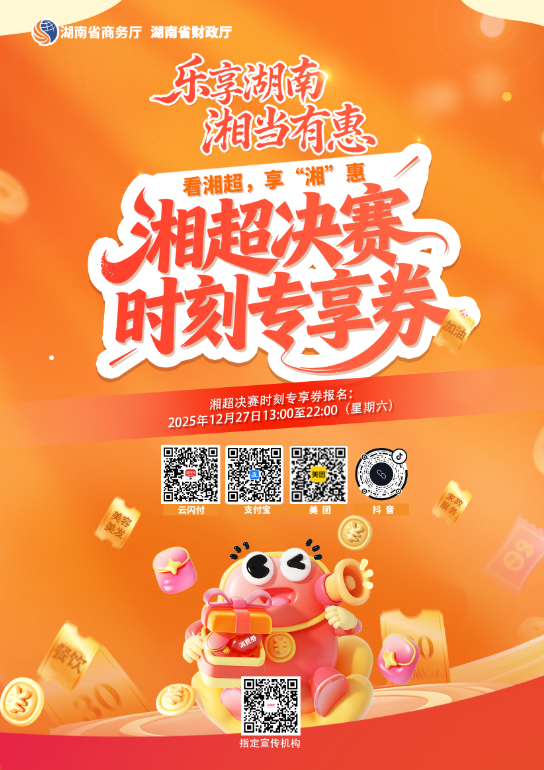 为持续激发市场活力,便利广大消费者就近享消费实惠,湖南省商务厅联合湖南省财政厅近日对“2025‘乐享湖南·湘当有惠’”消费券活动进行专项消费服务升级,特别增设线下“湘超决赛时刻专享券”现场领取通道,将促消费活动与体育赛事深度融合,进一步提升市民参与体验与获得感。
