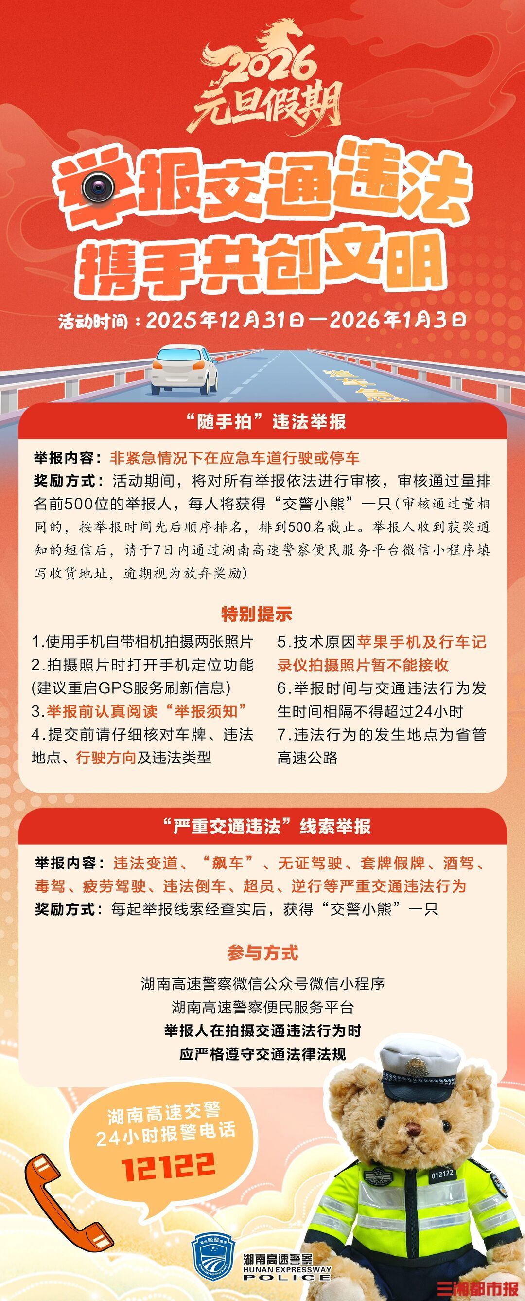 元旦假期高速出行,发现占用应急车道违法行为可“随手拍”举报。湖南高速警察微信公众号通报了500台被群众举报的车辆,这些车辆的驾驶人已被依法处罚。同时交管部门在元旦假期继续开展“举报交通违法 携手共创文明”违法举报活动,符合条件的参与者将获得交警小熊1只。