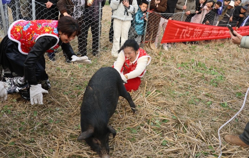 年俗的灵魂在于参与。作为“杀年猪·品年味”环节的重头戏,抓猪活动点燃了全场热情。