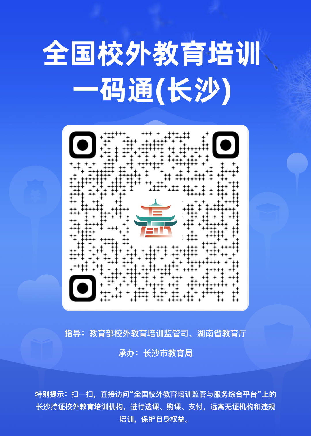购课时,请认准正规缴费渠道——全国校外教育培训监管与服务综合平台的家长端APP,也可扫描“长沙一码通”二维码进行选课、缴费等操作。切勿向机构个人账户转账,避免资金风险。