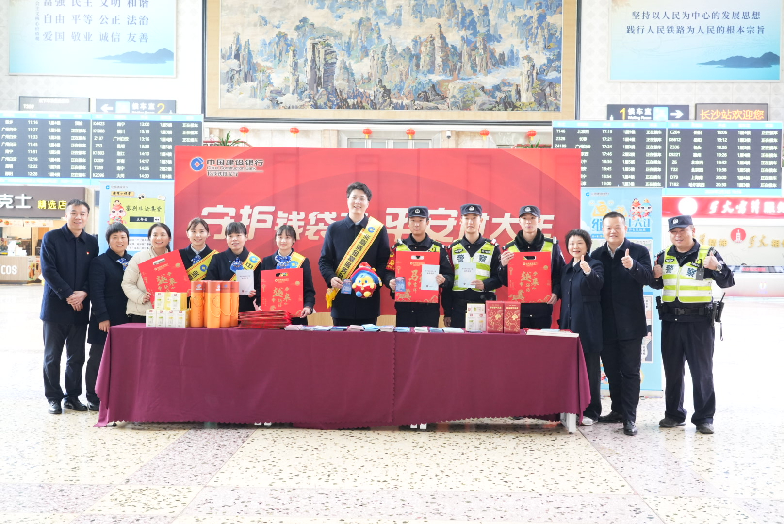 长沙火车站,南来北往的旅客步履匆匆。建行长沙铁银支行青年志愿者身披绶带,在车站大厅设立宣传点,开展“守护‘钱袋子’,平安过大年”主题宣传。