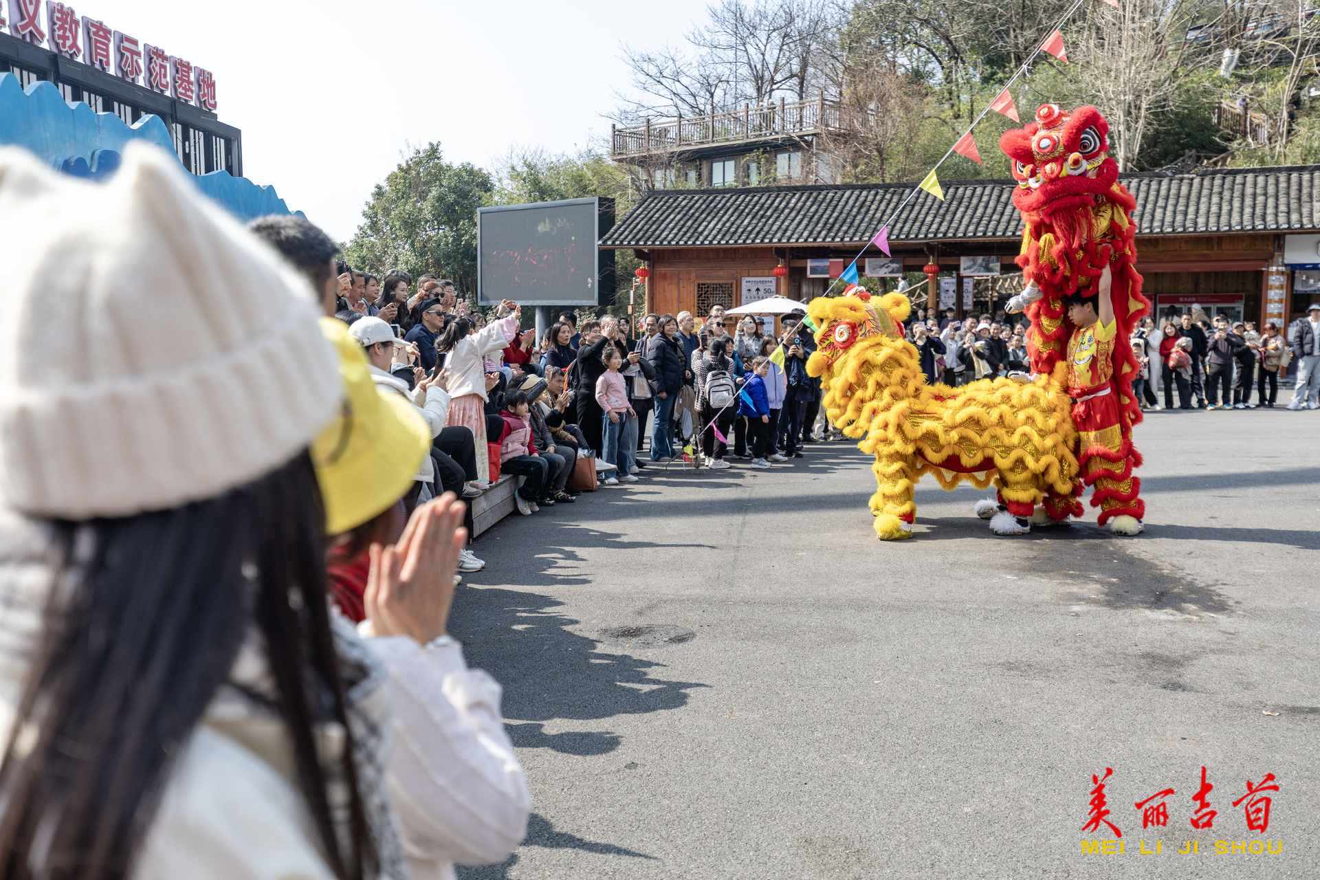 游客在观看舞狮表演。