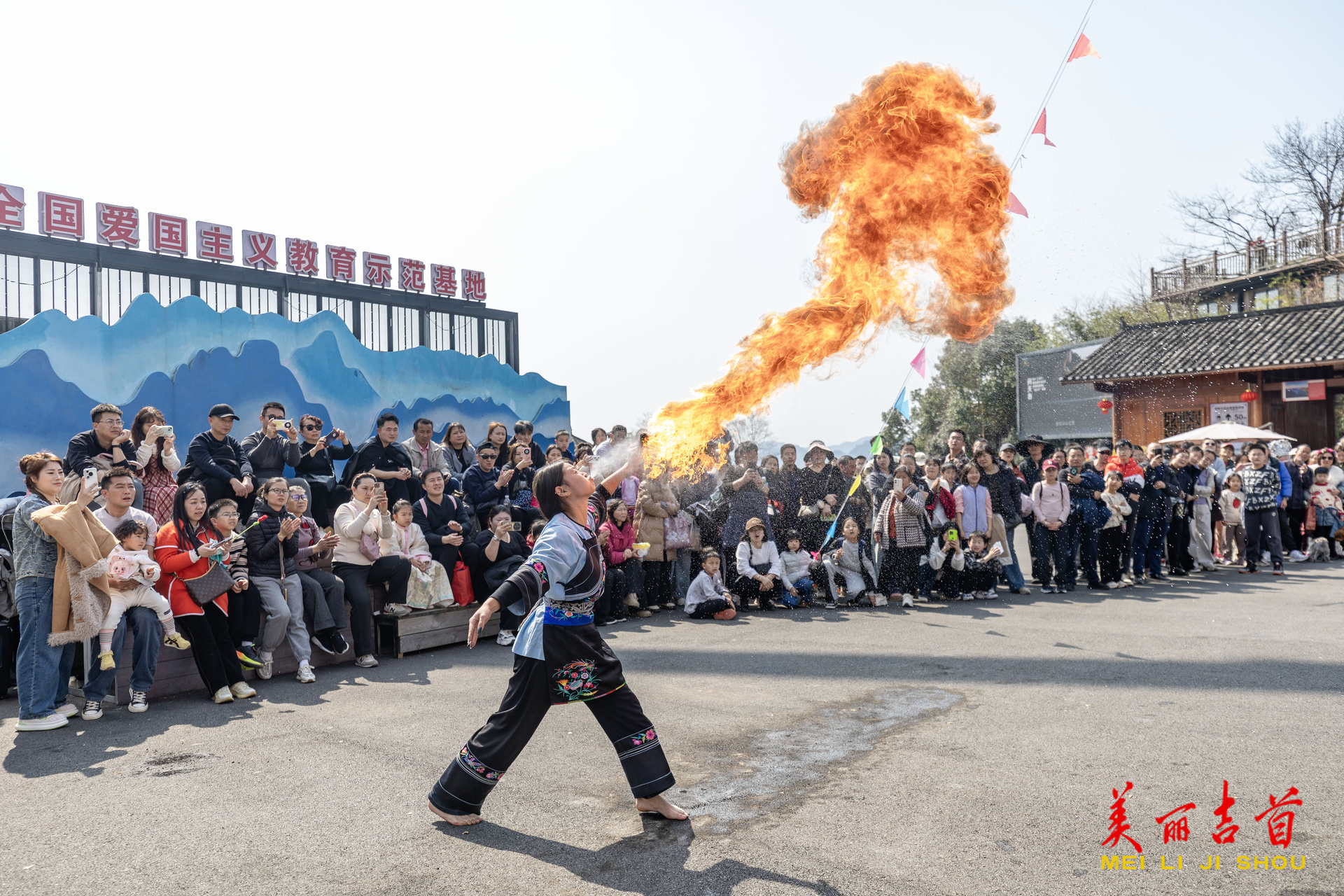 游客在观看民间艺人表演苗族绝技喷火。
