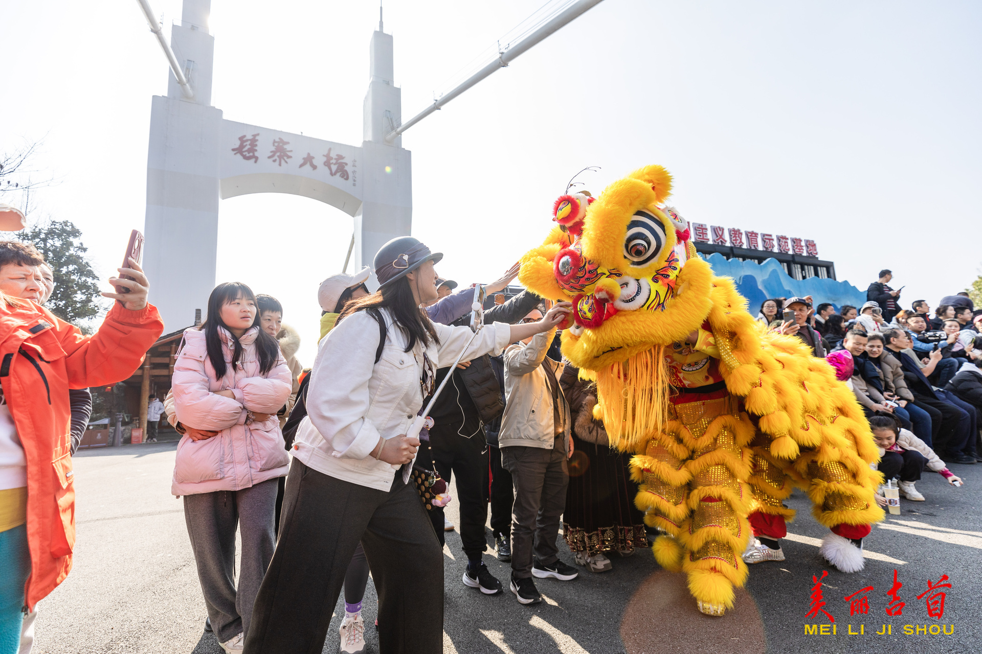 游客在与舞狮互动。