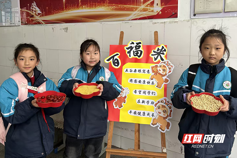 启明小学校园里洋溢着“百福”暖意,五谷杂粮寓意团圆安康,寄托着对学子平安成长的殷切期望。