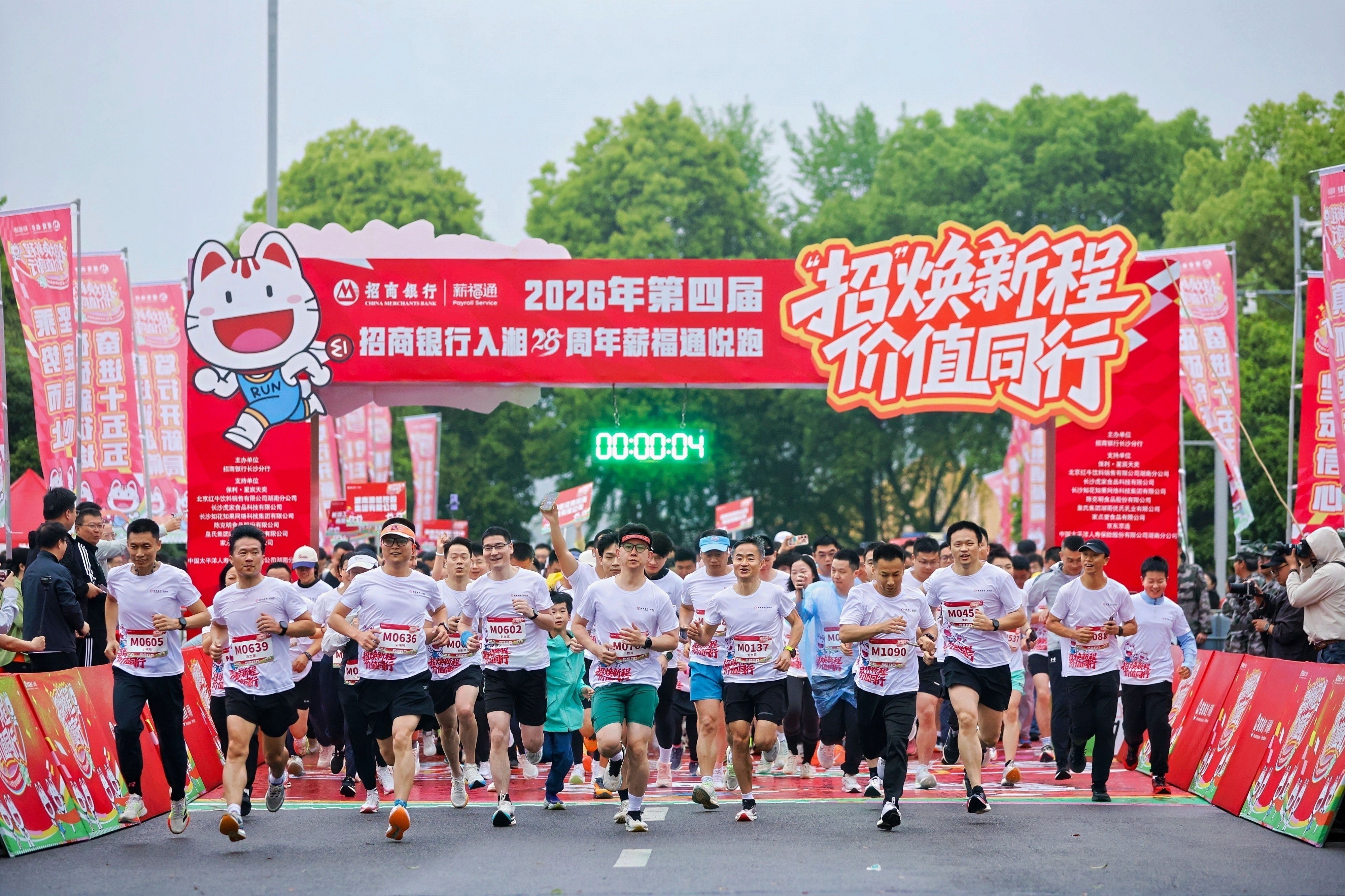 春风送暖,万物勃发;湘江奔涌,橘洲欢腾。2026年4月12日上午8时,招商银行长沙分行入湘 28 周年第四届薪福通悦跑活动于长沙橘子洲头盛大启幕、鸣枪开跑。本次活动以“招焕新程,价值同行”为主题,汇聚超 1000 名企业客户代表、招行员工,组建百余支活力跑团,在 5.8 公里的沿江赛道上并肩奔跑、共赴美好。活动创新设置企业品牌游园会,携手陈克明食品、京东京造、皇氏集团湖南优氏乳业、中国太平洋人寿保险湖南分公司等9家知名企业,以活力奔跑联结银企情谊,以品牌盛宴共筑生态共赢,续写招商银行与湖南企业价值同行、共生共荣的崭新篇章。